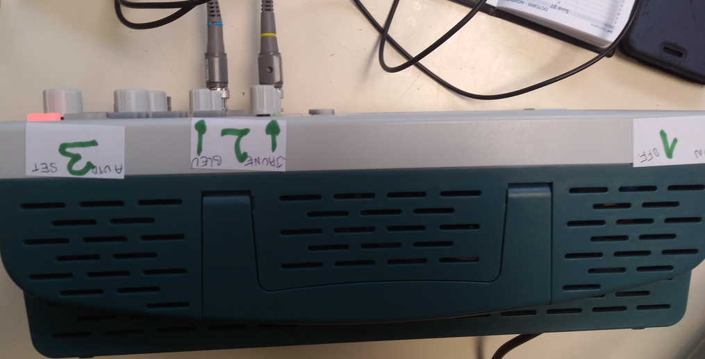 L’utilisation d’un appareil de mesure “multimètre” n’est pas évidente. Paul essaie maintenant un oscilloscope. Il manque des autocollants pour indiquer les boutons essentiels mais il a un mode automatique pour afficher. L’oscilloscope devient un jeu d’enfant !