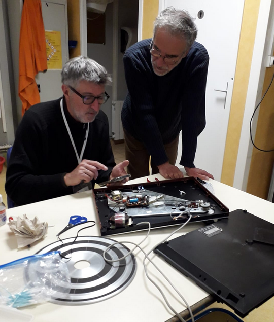 C’est la rentrée mercredi aux Muses. Il reste des pannes de la ressourcerie à finir. Opération de la dernière chance pour Richard avec ce lecteur de CD : le moteur d’entraînement du disque n’est plus disponible mais les enceintes de la chaîne HIFI peuvent resservir pour d’autres personnes.