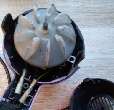 Ce genre de problème sur sèche-cheveux est malheureusement un grand classique : la couronne du ventilo se détache et vient s’user sur la grille arrière du sèche-cheveux ; le moteur a été remonté sur son support après un collage époxy 2 composants.