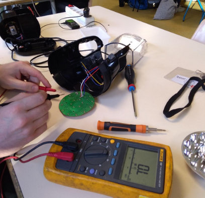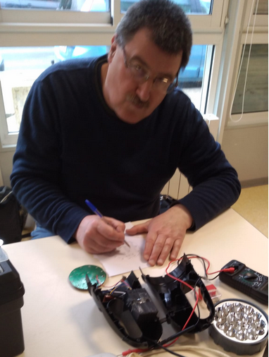 Heureusement, nous avons des outils. Avec une plaque spéciale pour dessouder, Thierry a pu retirer les LEDs défectueuses pour les remplacer. Après le circuit de recharge sera à adapter pour une batterie de recyclage. Zéro plastique !