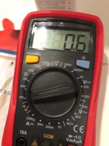 On va pouvoir tester le fusible thermique, en mettant les pointes du ohmmètre (calibre 200) sur le pôle négatif de la résistance et sur l’une des deux bornes de la prise. Sur l’une des deux bornes, la résistance doit être très faible (0,6 ici). Sinon, cherchez un éventuel interrupteur ouvert, mais vous avez un bon candidat. Le fusible thermique est une pièce qui se remplace très facilement, et on en a toujours en stock au Repair Café.