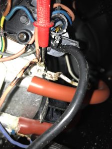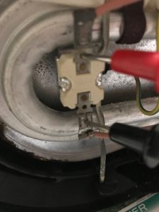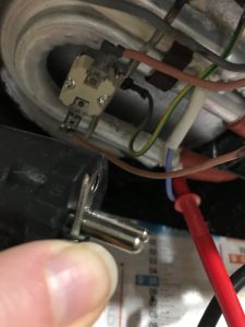 Il reste le Klixon à tester. Un klixon est une sorte d’interrupteur thermique : quand il est froid, il laisse passer le courant, et quand il atteint une certaine température, il ouvre le circuit. La résistance n’est donc plus alimentée et cesse de chauffer jusqu’à descendre sous la tempétature à laquelle le klixon redeviendra passant, etc, etc. Là, notre résistance est froide et le klixon doit donc être passant. Mais le ohmmètre mesure le contraire : le klixon est défecteux. Comme le fusible thermique, il s’agit d’une petite pièce toujours disponible au Repair Café.