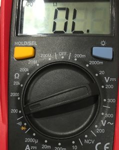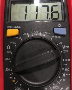 Tout d’abord la résistance : si la résistance est défectueuse, la réparation ne sera sans doute pas économiquement viable. Il faut placer le multimètre en “ohmmètre”, calibre 200, et placer les pointes du multimètre aux deux bornes (pôle positif et pôle négatif) de la résistance. Le multimètre doit afficher environ 120.