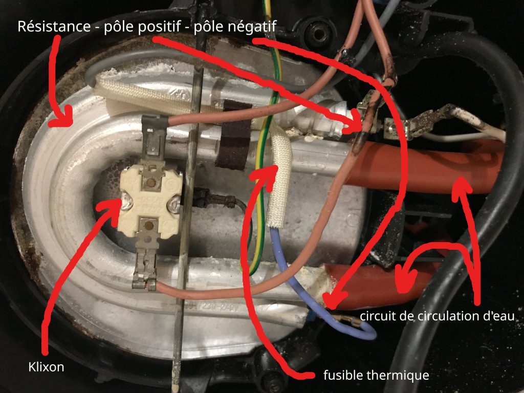 Quasiment tout le circuit électrique de la cafetière est accessible :-). Il s’agit essentiellement d’une résistance (partie gris clair). Le courant circule entre le pôle positif (fil électrique de couleur rouge) et le pôle négatif (fil électrique de couleur bleue) de la résistance. Un fusible thermique est présent dans le gaine en tissu blanc. Un klixon est branché sur le fil rouge d’alimentation de la résistance. L’eau circule dans le tuyau rouge et est chauffée dans le tuyau gris accolé à la résistance.